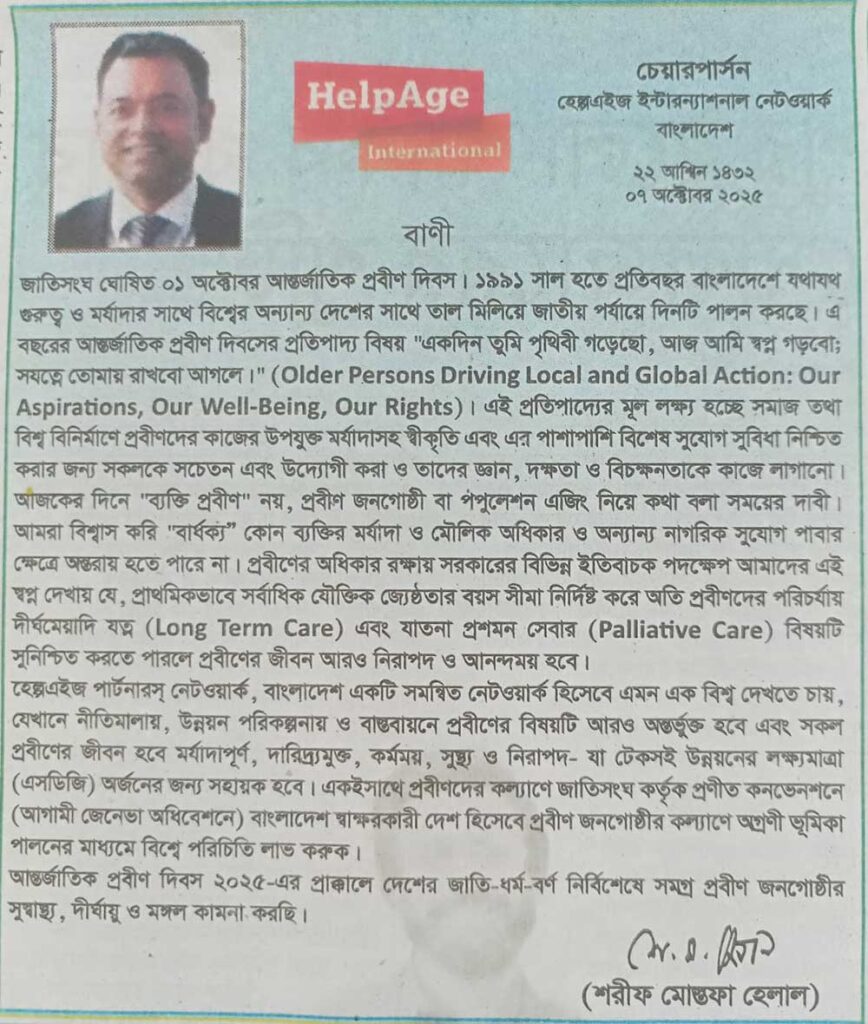 The Bangladesh Women’s Health Coalition (BWHC) and the HelpAge Network Partners, Bangladesh (HNPB), in collaboration with the Government of Bangladesh, jointly celebrated the United Nations-declared International Day of Older Persons (1st October). As the date coincided with a public holiday this year, the event was observed on 7 October 2025.
